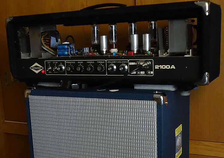 Stramp A 2100 (Vintage Umbau), Morgana Vintage Boutiqe Amp, Pro Drive - Tube 10, Hughes & Kettner Tubeman, Zoom 9050, diverse Bodenpedale wie z.B. Org.Tubescreamer 808, Boss SD1 uvm., diverse Boxen und Speaker.